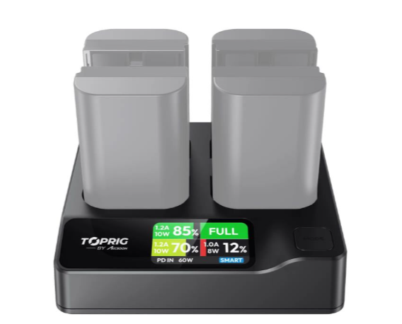 Rychlá nabíječka Accsoon TOPRIG ACC-BC-03 100W 4-Bay LP-E6 je určena pro fotografy a kameramany, kteří potřebují rychlé, bezpečné a efektivní nabíjení baterií Canon LP-E6. Čtyři samostatné nabíjecí pozice umožňují současné nabíjení, zatímco zaoblené kontakty baterií zajišťují bezpečný kontakt a pomáhají prodloužit životnost baterií. Nabíječka disponuje inteligentními režimy rychlého a bezpečného nabíjení, které automaticky upravují výstupní výkon, aby chránily vaše baterie a zároveň minimalizovaly dobu nabíjení. Plně barevný LCD displej zobrazuje stav nabíjení každé baterie, což usnadňuje sledování úrovně nabití. Díky kompatibilitě s USB-C PD 3.0 a podpoře vstupu 9 V, 12 V, 15 V a 20 V je tato nabíječka univerzální a vysoce výkonná, ideální pro použití na place nebo na cestách.