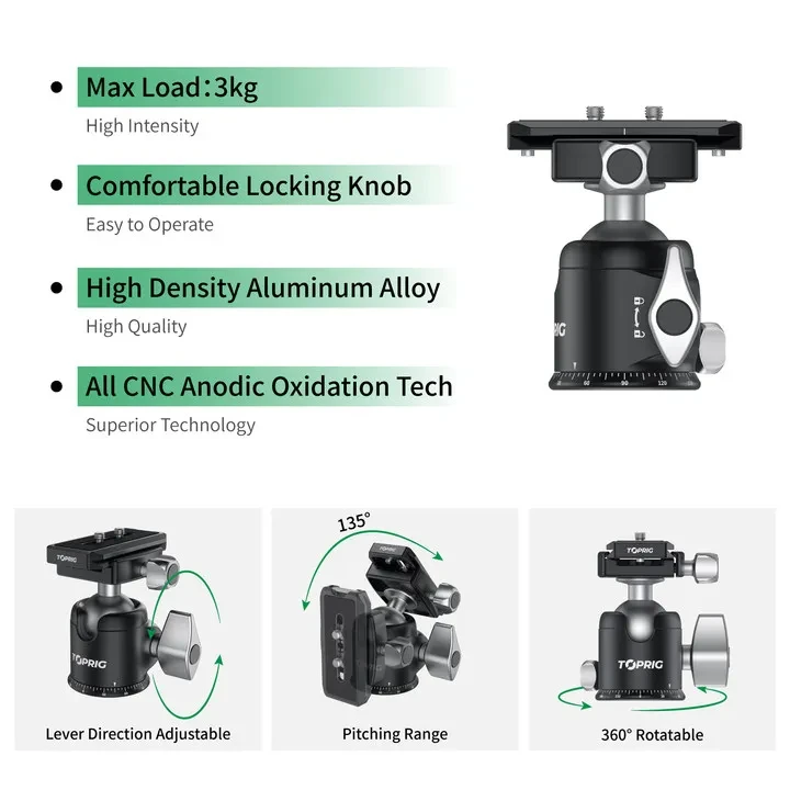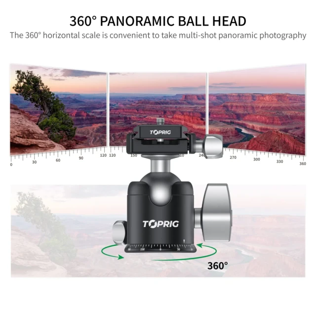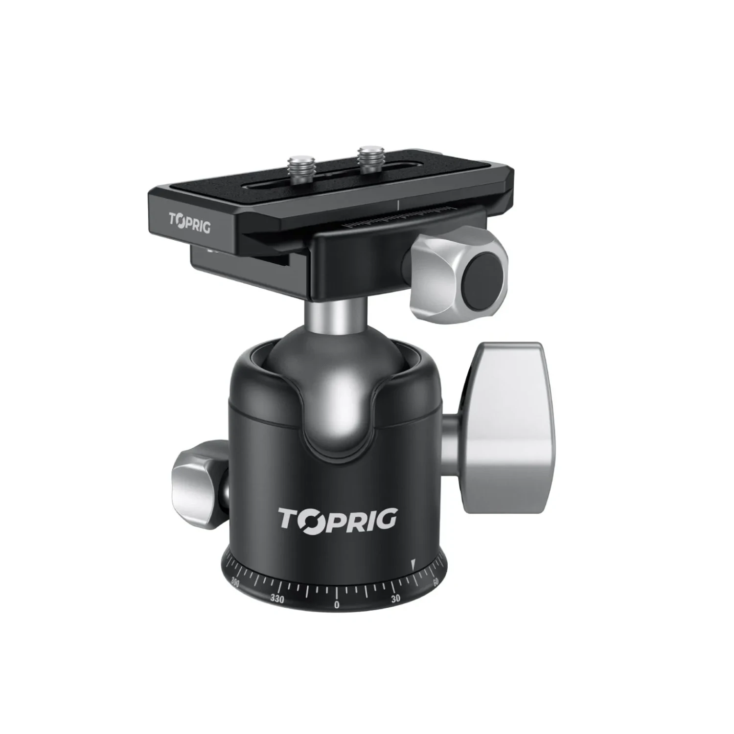 Hlavice TopRig Ball Head je vybavena 36mm přesnou kulovou hlavou, která umožňuje plynulé nastavení úhlu a 360° panoramatické otáčení, což umožňuje plynulé fotografování krajiny, portrétů a panoramat. Průměr základny 51 mm zvyšuje stabilitu, zatímco integrovaná 1/4” rychloupínací deska zajišťuje rychlé připevnění a sejmutí fotoaparátu.