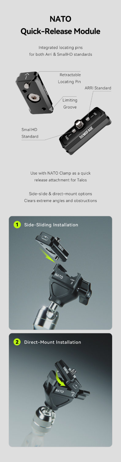 Dvoustandardní (Arri & SmallHD) NATO lišta je navržena tak, aby byla montáž všestrannější a pohodlnější. Zvyšují se tak možnosti celé vaší sestavy.
