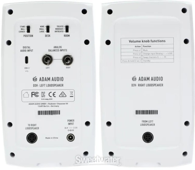D3V je vybaven vstupem USB-C a dvěma symetrickými zásuvkami TRS, takže nabízí kvalitní digitální i analogové připojení. Zjednodušené ovládání zahrnuje multifunkční knoflík hlasitosti, intuitivní přepínače pro kompenzaci místnosti a vícebarevný indikátor stavu. Model D3V je dodáván s odnímatelnými stojany pro monitory a také s vestavěnými závitovými body pro montáž mikrofonních stojanů (3/8″) pro dokonalé umístění v jakémkoli prostředí.