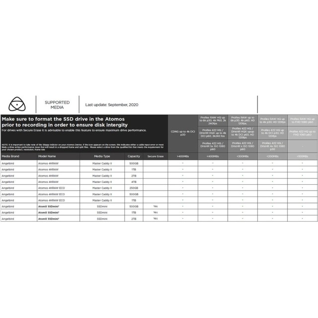 Disk AtomX SSDmini od společnosti Angelbird byl vyroben na zakázku pro nový monitorový rekordér Atomos Ninja a je dokonale kompatibilní se všemi ostatními dostupnými rekordéry. Disk AtomX SSDmini je o 20 % menší než průměrný SSD disk (aby se vešel do malých rozměrů modelu Ninja), nabízí 1 TB úložného prostoru, má trvalou rychlost čtení 540 MB/s a zápisu 500 MB/s, zachycuje CDNG až do rozlišení 4K 30p, ProRes RAW HQ 5,7K až do 30p a navíc 4K 60p a 2K 240p, má konektor SATA III a podporuje technologii Stable Stream™, díky níž nikdy nevynecháte žádný snímek.