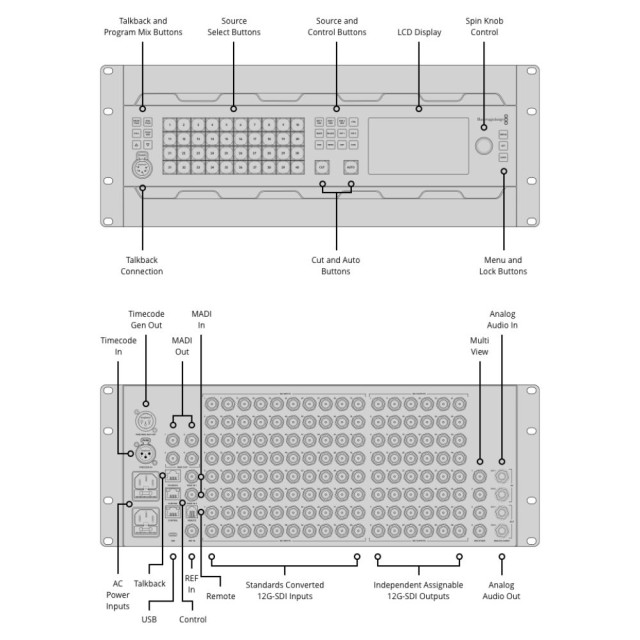 Každý vstup zařízení je vybaven samostatným konvertorem, což umožňuje převést jakýkoli SDI video vstup na výstupní standard přepínače. Je možné mít každý SDI vstup přepínače v jiném televizním standardu – a všechny budou fungovat bez problémů. Můžete dokonce vystupovat audio na více digitálních MADI výstupech, což vám umožní předat zvukové zdroje z přepínače externímu zvukaři pro samostatné míchání.