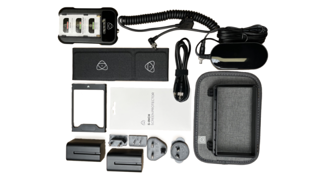 Sada příslušenství Atomos 5" pro modely Ninja a SHINOBI obsahuje: sluneční clonu, ochranný kryt obrazovky, DC kabel, rychlonabíječku, dvě baterie NP-F750 5200 mAh a pouzdro EVA