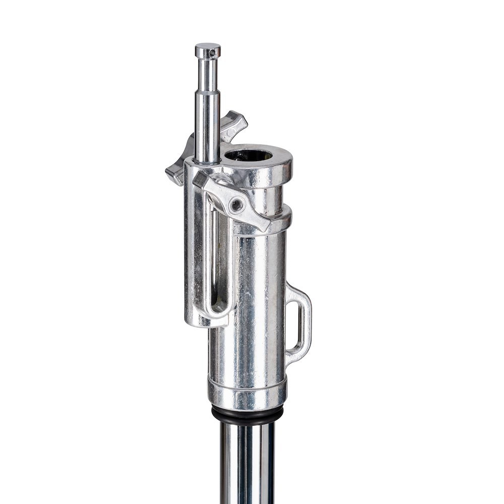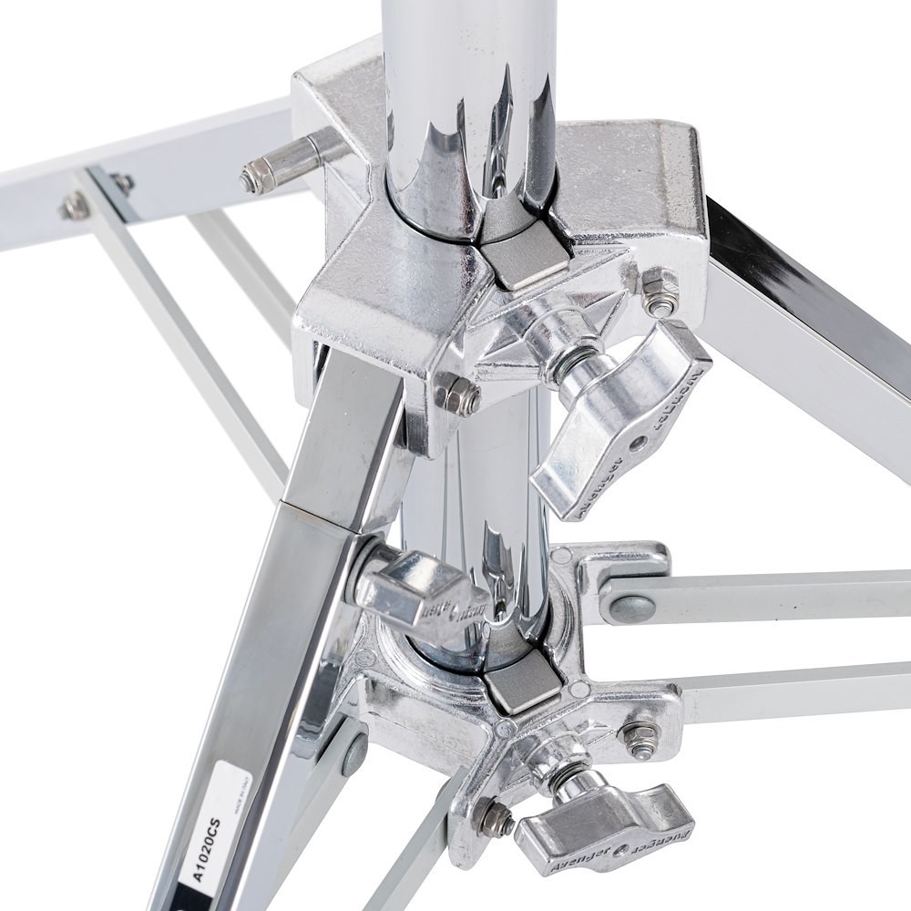 Chromovaný ocelový kombinovaný světelný stojan Avenger A1020CS s vyrovnávací nohou je odolný stojan schopný unést zatížení 35 kg/77 lb ve výšce 200 cm/78,7 palce. Tento chromový ocelový kombinovaný stojan má kombinovaný nebo univerzální typ horní části, který zahrnuje 28 mm/1 1/8 palce Junior Receiver a vestavěný zasouvací 16 mm/5/8 palce bez závitu zasouvací baby pin. Vestavěná vyrovnávací noha umožňuje snadné nastavení na nerovném terénu a povrchu. Kromě toho mobilní sloup, který je zajištěn 2 uzamykatelnými T-rukojeťmi v odlitcích pavouka, umožňuje spuštění sloupu, aby uživatel v případě potřeby získal čtvrtý kontaktní bod pro větší stabilitu. Uzamykatelné T-rukojeti a uzamykatelné objímky znamenají, že nehrozí riziko ztráty rukojetí, i když se zcela odšroubují. Tento kombinovaný stojan je velmi oblíbený u LED světelných panelů 1X1 a 2X1! Doporučené příslušenství: Sada kol A9000N, D400, E200, C590, 087WBK, G200-1, E390, D400B, D240, D230, D220, C1575B, E600, D800KIT, D530L