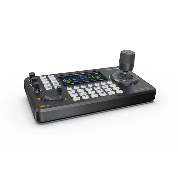 AVMatrix PKC3500 je kompaktní, ale výkonný ovladač PTZ určený pro živé vysílání, vzdělávání a kostely. Jeho jasný 5palcový dotykový displej zobrazuje dekódované video v reálném čase až ze 4 kamer současně, zatímco přesný 4D joystick a T-bar zajišťují plynulé a intuitivní ovládání otáčení, naklánění, přiblížení a zaostření.