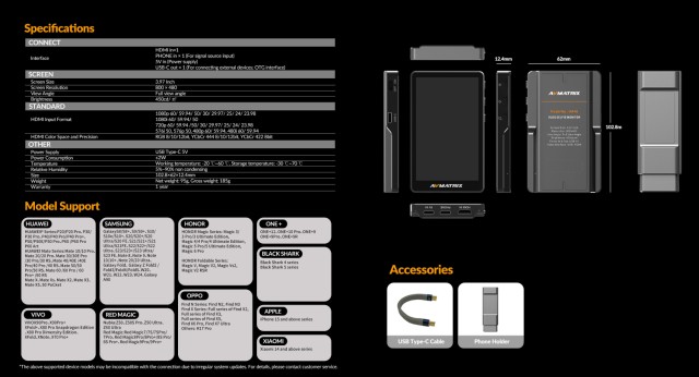 AVMatrix Vlog Selfie Monitor. 3×porty typu C; USB-C OUT podporuje funkci OTG pro připojení USB příslušenství, jako jsou doplňková světla, a poskytuje výstupní napájení. Kompatibilní s většinou špičkových smartphonů s plně funkčními porty typu C; podporuje vstup HDMI 1080p. 3,97palcová obrazovka s interakcí dvou obrazovek v reálném čase.