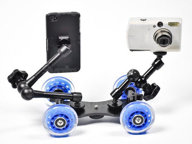 Kompletní sestava kamerového ramena, statiových noh, kolečkové základny a motorické