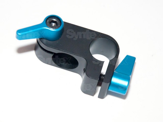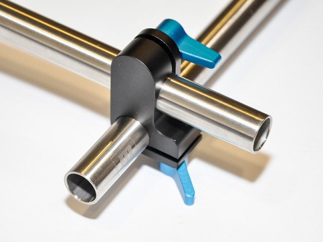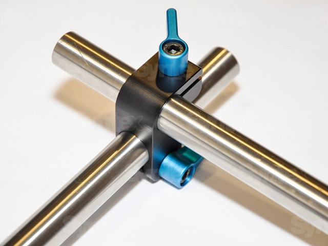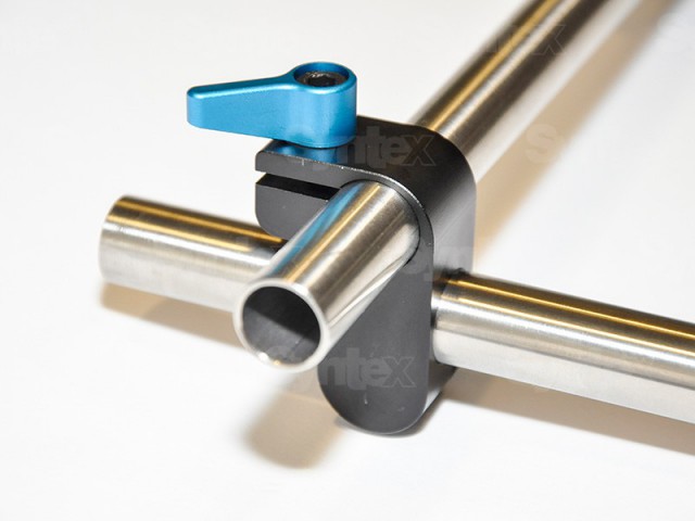 Úhlový tyčový adaptér. Umožňuje připojit tyče k sobě v pravém úhlu. Používá se pro tyče o průměru 15 mm.
