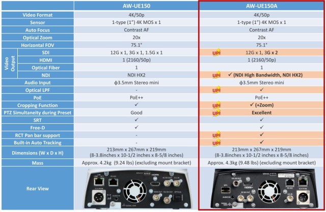 UE150A kamera je vybavena vysoce citlivým 1.0-senzorem a nabízí široký dynamický rozsah pro plynulou gradaci a vysokou kvalitu videa. Hlavním upgradem je vylepšený optický stabilizátor obrazu (OIS) s interními mechanismy pro snížení chvění obrazu při pohybech panoramování a naklánění a vylepšená synchronizace přednastavených pozic panoramování, naklánění a zoomu pro plynulejší a přirozenější pohyby kamery.