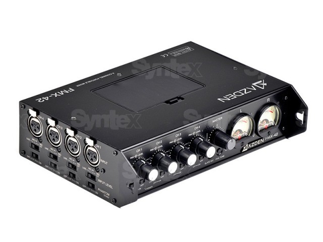je vybaven čtyřmi linkovými/mikrofonními vstupy XRL s individuálním nastavením úrovně a panoramy, přepínatelným 48V fantomovým napájením pro každý kanál zvlášť, profesionálními VU metry pro přesné nastavení úrovně, hlavním nastavením úrovně, 1k tónovým generátorem, dvěma vyváženými výstupy XLR (přepínatelnými mezi linkovým a mikrofonním výstupem), stereofonním výstupem mini-jack, 10pinovým konektorem pro zvuk z kamery a sluchátkovým výstupem s nastavením úrovně.Azden FMX-42 lze napájet pomocí 6xAA baterií nebo z externího zdroje (není součástí dodávky) přes uzamykatelný 4pinový konektor Hirose. Součástí balení je profesionální brašna na mix s popruhem na přenášení.