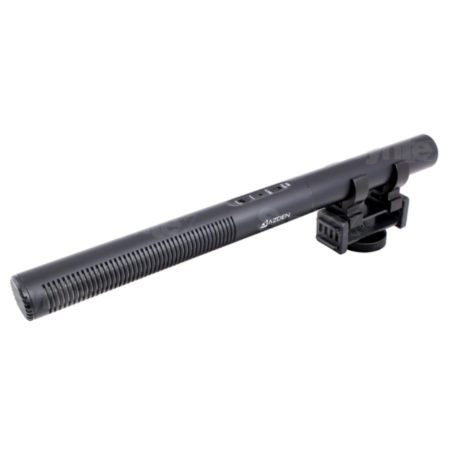 Azden SGM-250 Vysílací mikrofon s duálním napájením a výstupem XLR. Součástí je držák na náraz, pěnový kryt a pouzdro na zip.