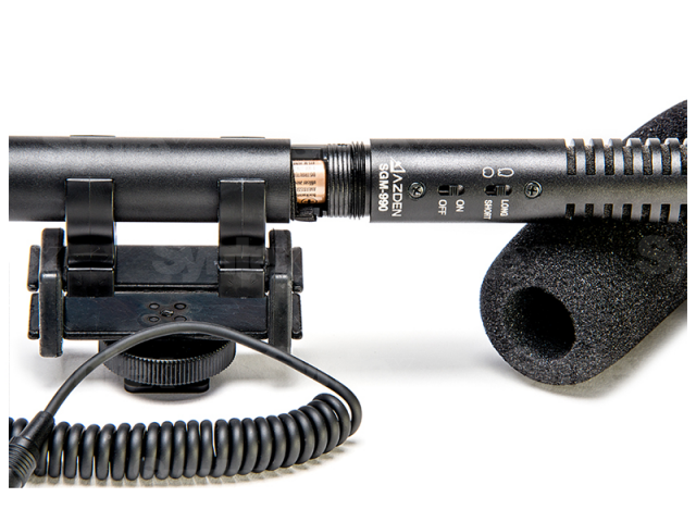 Azden SGM-990+i je 15cm „puškový“ mikrofon s přepínatelnou směrovou charakteristikou určený pro DSLR/DSLM kamery (3,5mm jack) a mobilní zařízení (kompatibilní s přiloženou TRRS redukcí, tabulka kompatibility zde). Jeho unikátní vlastností je možnost přepínat mezi úzkou a širokou směrovou charakteristikou – režim „Long“ je určen pro záznam zvuku z větší vzdálenosti a velké potlačení zvuku ze stran, kardioidní mód „Short“ slouží k natáčení na kratší vzdálenosti. Oba režimy poskytují dobré potlačení zvuku ze zadní polosféry i ze stran.
