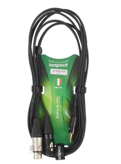 Bespeco EAYMS2FX300R je propojovací kabel XLR(F) na 3,5 mm TRS (3 m, černý) s vodiči z bezkyslíkaté mědi (OFC), polovodivým vnitřním pláštěm z PVC pro bezšumový přenos, 92% spirálovým stíněním, pozlacenými konektory s hliníkovým tělem a modernizovanou pojistkou na XLR(F) a odolným pláštěm z PVC/vulkanizovaného silikonu, který zajišťuje vysokou spolehlivost zvuku v profesionálních sestavách.