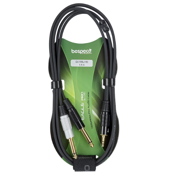 Bespeco EAYMSJ150 je propojovací kabel 3,5 mm TRS na duální 6,3 mm TS (1,5 m, černý) s 98% OFC vodiči, polovodivým PVC vnitřním pláštěm pro tichý provoz, 92% spirálovým stíněním, pozlacenými hliníkovými konektory a odolným PVC/vulkanizovaným silikonovým pláštěm – poskytuje čisté rozdělení stereo-mono nebo směrování signálu v profesionálních audio sestavách.