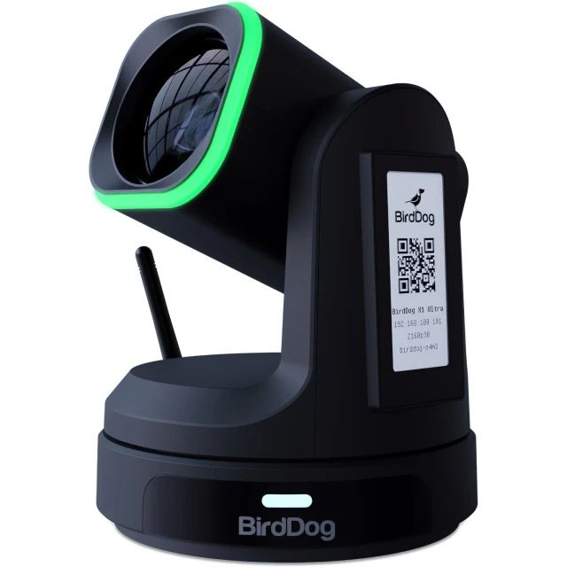 Chytré funkce: AI Auto-Tracking, Halo Tally a 2,93″ stále aktivní E-Ink štítek pro okamžité zobrazení IP adresy nebo ID kamery. Ovládání možné přes BirdUI, iOS aplikaci, Q-SYS, Crestron nebo Companion.