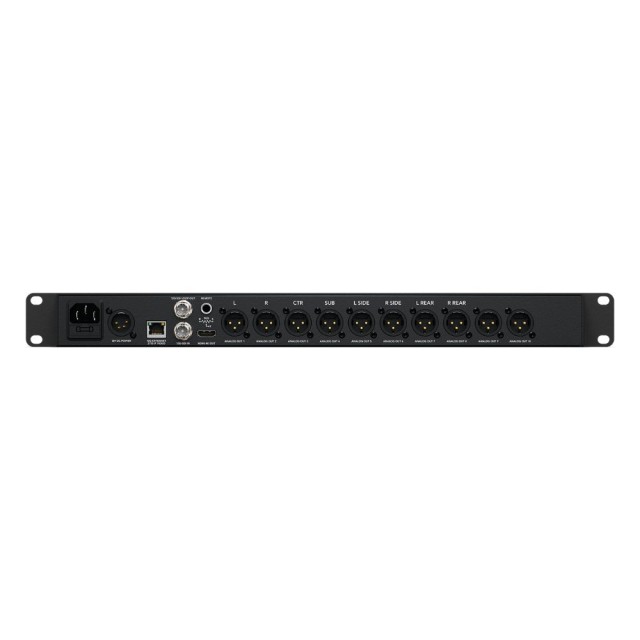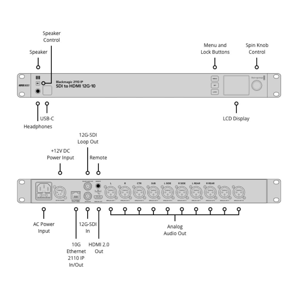 Blackmagic 2110 IP SDI to HDMI 12G-10 zahrnuje deset kanálů XLR analogového audio výstupu pro monitoring prostorového zvuku, což umožňuje dálkové ovládání hlasitosti a nastavitelné zpoždění, ideální pro sladění se zvukem na televizorech a projektorech. Obsahuje variable gain a delay pro dokonalou AV synchronizaci a 3D LUTs pro přesnou barevnou kalibraci HDMI displejů. Zařízení má čelní LCD displej s náhledem videa, úrovněmi zvuku a menu, dále reproduktor a sluchátkový výstup.