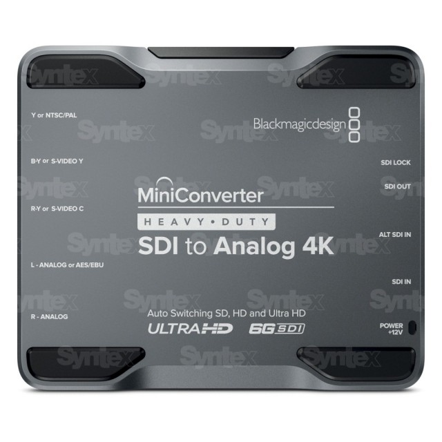 Mini Converter Heavy Duty SDI to Analog 4K konvertuje SDI video na analogový komponentní, S-Video nebo kompozitní signál. Automaticky přepíná mezi SD, HD a Ultra HD standardy a nabízí redundantní SDI vstup, down-konverzi, a také analogové nebo AES/EBU audio výstupy se zvukem dekódovaným z SDI dat. Tento model automaticky převede Ultra HD SDI signál na HD komponentní výstup, respektive na SD kompozitní nebo S-Video výstupy.