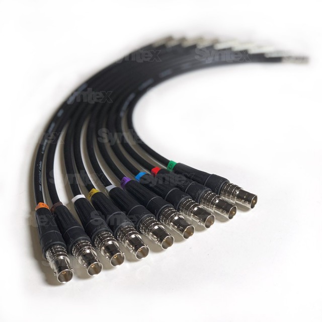 Sada kabelů je vyrobena z vysoce kvalitního, flexibilního koaxiálního kabelu, konektorů DIN 1.0/2.3 a BNC (samice) od japonského výrobce Canare.