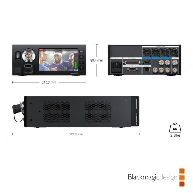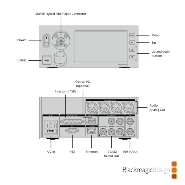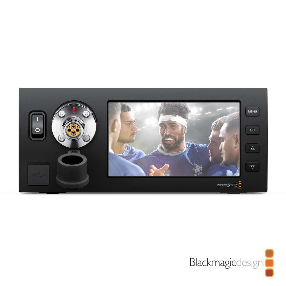 Kamerový převodník následně poskytuje běžné 12V napájení pro kameru a její příslušenství. Připojuje se k zadnímu panelu kamer URSA Mini a URSA Broadcast a převádí video i audio rozhraní, povely dálkového ovládání, komunikační i signalizační linky a napájení do standardního hybridního SMPTE vedení. A protože jsou studiové kamery téměř výhradně ovládány ze zadní kamerové pozice, nabízí převodník i standardní funkce studiových kamer. Lze ovládat náhledové linky z režie, interkom (dvě nezávislé sady), spouštění záznamu, clonu i zaostření. Na horní straně převodníku je k dispozici také rozhraní V-Lock pro další příslušenství, např. profesionální monitor Blackmagic Studio Viewfinder.