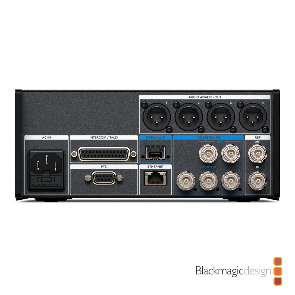 Kamerový převodník pak poskytuje normální 12V napájení pro kameru a její příslušenství. Připojuje se k zadnímu panelu kamer URSA Mini a URSA Broadcast a převádí video a audio rozhraní, příkazy dálkového ovládání, komunikační a signální linky a napájení na standardní hybridní zapojení SMPTE. A protože studiové kamery jsou téměř výhradně ovládány ze zadní pozice kamery, nabízí převodník také standardní funkce studiové kamery. Lze ovládat náhledové linky z režie, interkom (dvě nezávislé sady), spouštění záznamu, clonu a ostření. Na horní straně konvertoru je také rozhraní V-Lock pro další příslušenství, jako je profesionální monitor Blackmagic Studio Viewfinder
