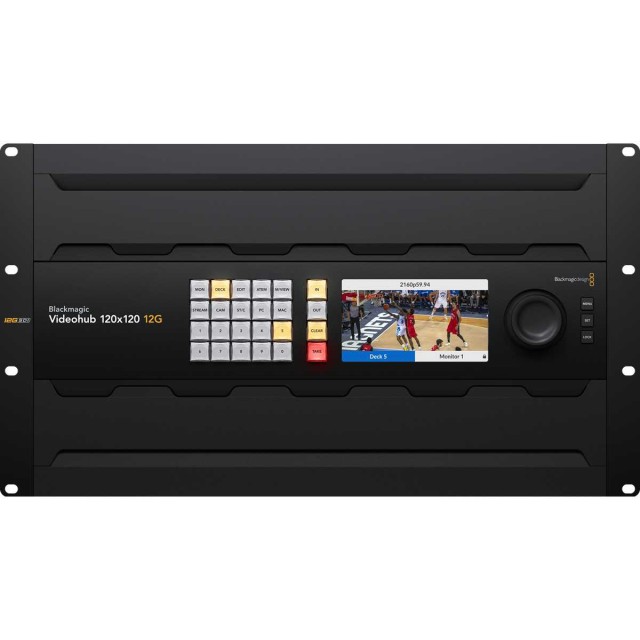 Video router Blackmagic Videohub 120x120 12G je vybaven předním panelem s tlačítky pro snadné propojování, LCD displejem, který může zobrazovat popisky nebo živé video, kovovým otočným knoflíkem pro procházení zdrojů videa, referenčními přípojkami a redundantním napájením. Nabízí také nulovou latenci, re-clocking SDI a externí ovládání přes Ethernet. K dispozici od 4/2024.
