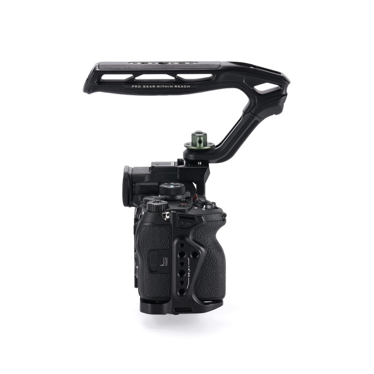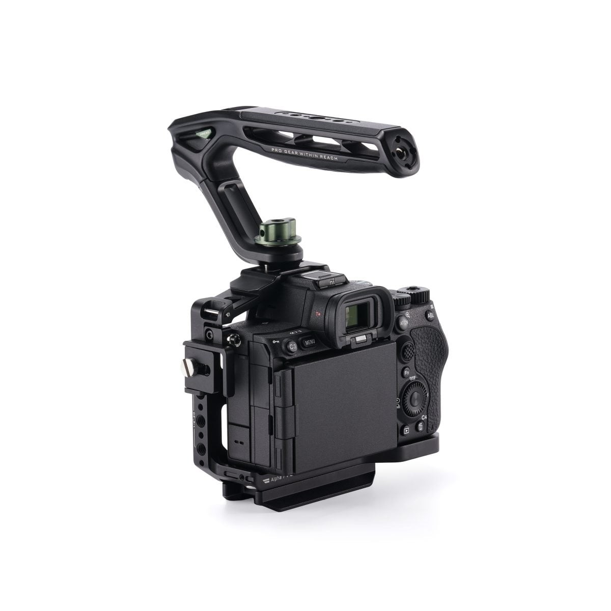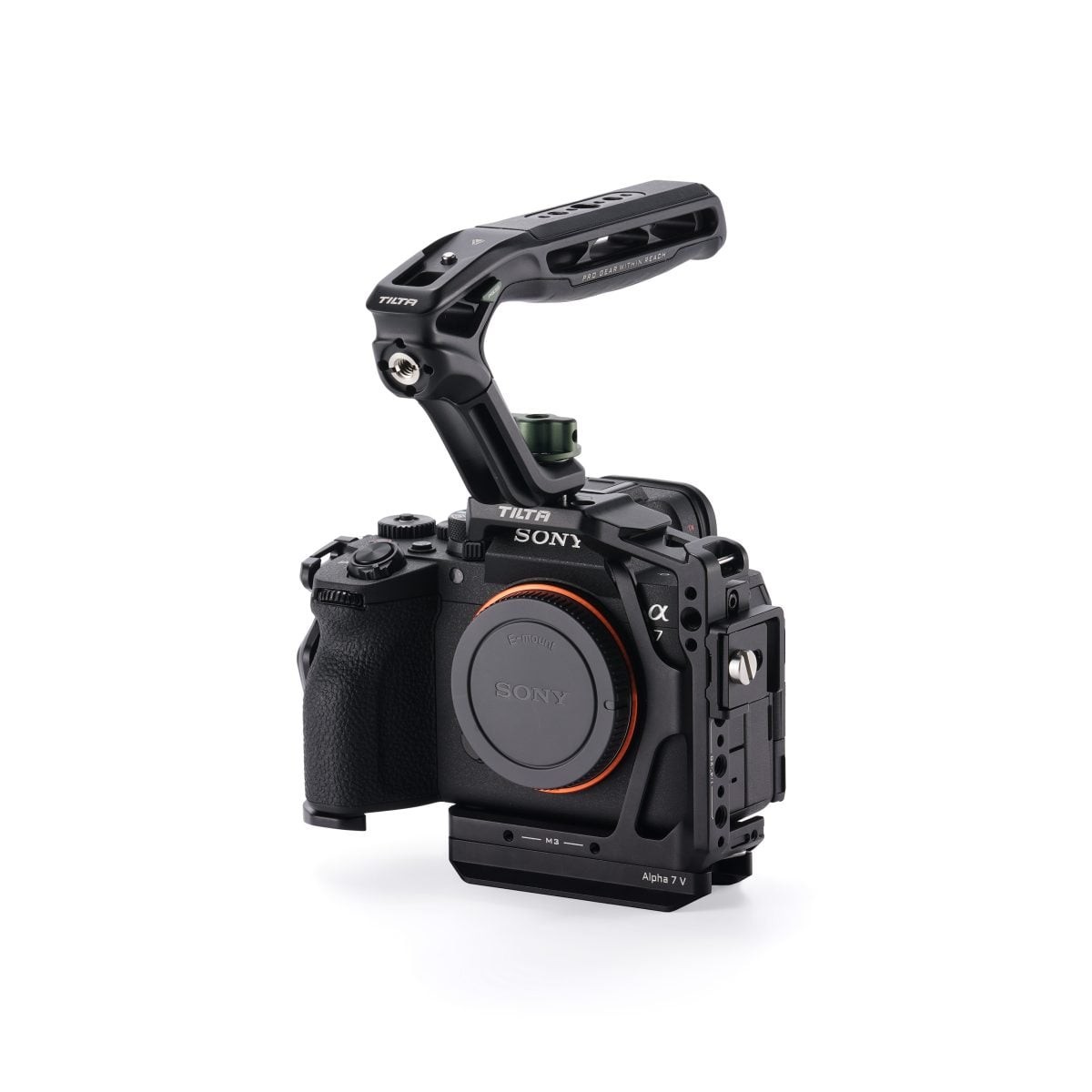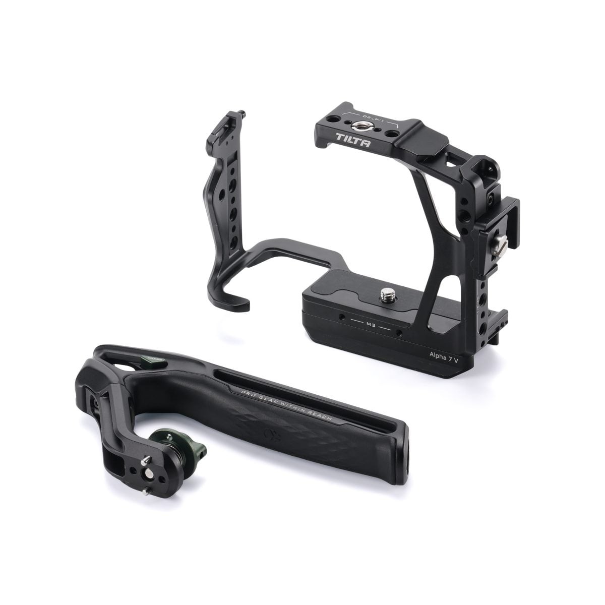 Sada obsahuje horní rukojeť Tilta Xeno, která se připevňuje pomocí závitů 1/4"-20, což zvyšuje přilnavost a flexibilitu ovládání. Tato horní rukojeť rozšiřuje montážní body pro další příslušenství a poskytuje lepší kontrolu při ručním natáčení. Její ergonomický design doplňuje lehký profil klece, aniž by byla ohrožena stabilita.