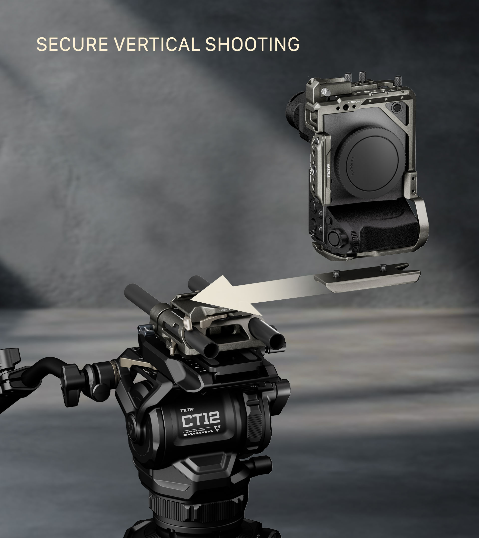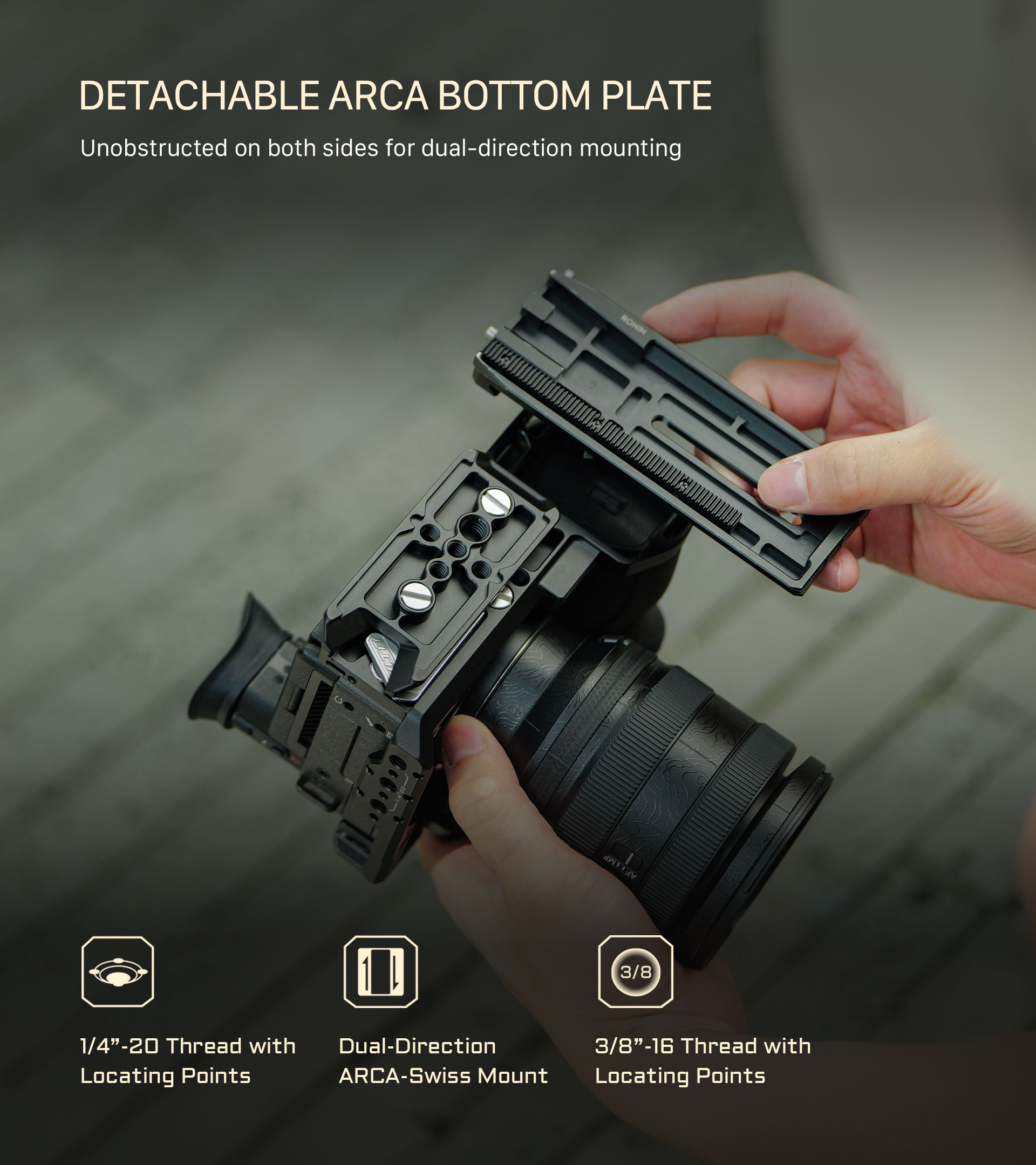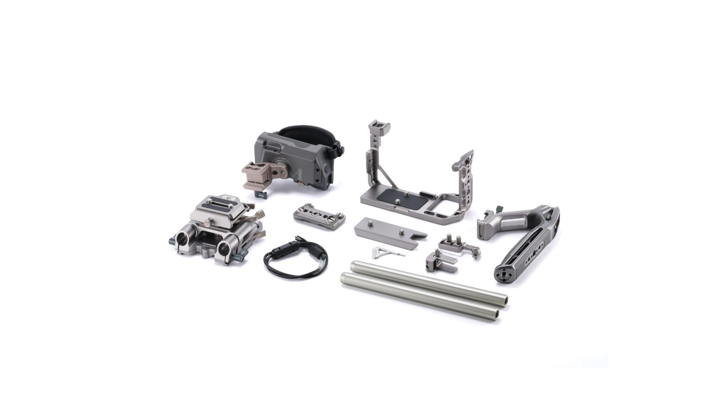 Představujeme kompletní sadu kamerového rámu Pro Kit pro Sony FX2. Tento kamerový rám podporuje různé příslušenství prostřednictvím upevňovacích bodů, jako jsou závity 1/4”-20 a 3/8″-16 s různými polohovacími body, přijímač studené patky, kolejnice NATO a upevňovací body pro držák jedné tyče. Nová obousměrná spodní deska ARCA je ideální pro rychlý přechod mezi stativem a gimbaly DJI. Tato deska je nyní odnímatelná, což uživatelům umožňuje ji rychle sejmout a namontovat na bok klece, aby bylo možné snadno přejít do vertikální konfigurace. Upozorňujeme, že tato klec používá standard DJI pro ARCA. Kompatibilita s jinými standardy není zaručena.