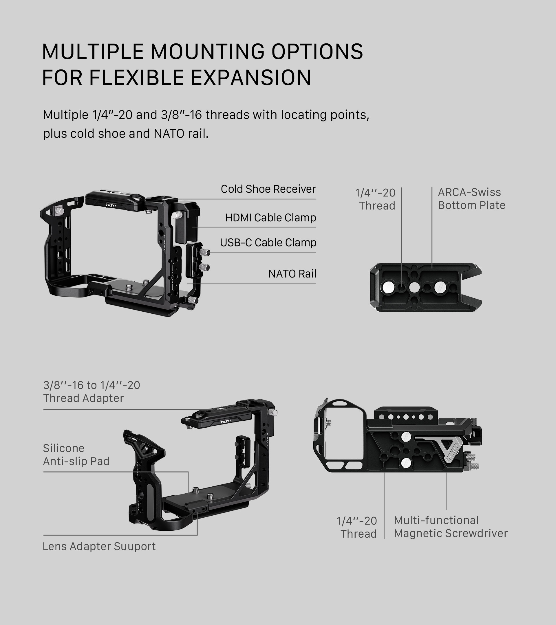 Tento kamerový klec podporuje různé příslušenství prostřednictvím montážních bodů, jako jsou závity 1/4”-20 a 3/8″-16 s různými polohovacími body, přijímač studené patky, kolejnice NATO a montážní body pro držák jedné tyče.