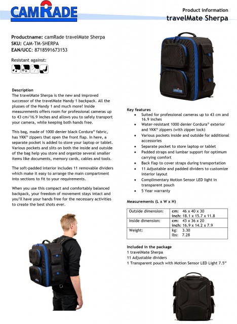Kamerový batoh travelMate Sherpa je nástupcem oblíbeného modelu travelMate Handy 1. Nabízí dostatek prostoru pro bezpečnou přepravu kamer délky až 43 cm, odolný materiál (Cordura®) a kvalitní zipy (YKK®), samostatnou přihrádku pro tablet/laptop na přední straně a samozřejmě také vnitřní i vnější kapsy pro transport dokladů, paměťových karet, kabeláž apod.