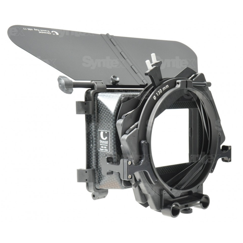 Kompendium MatteBox 450W Super Wide pro širokoúhlé objektivy, s dvojitým rotačním zásobníkem filtrů, klapkou 450-11, dvěma držáky filtrů 4x4/4x5.650 (410-31), objímkou pro 15mm a adaptérem Ø130mm.