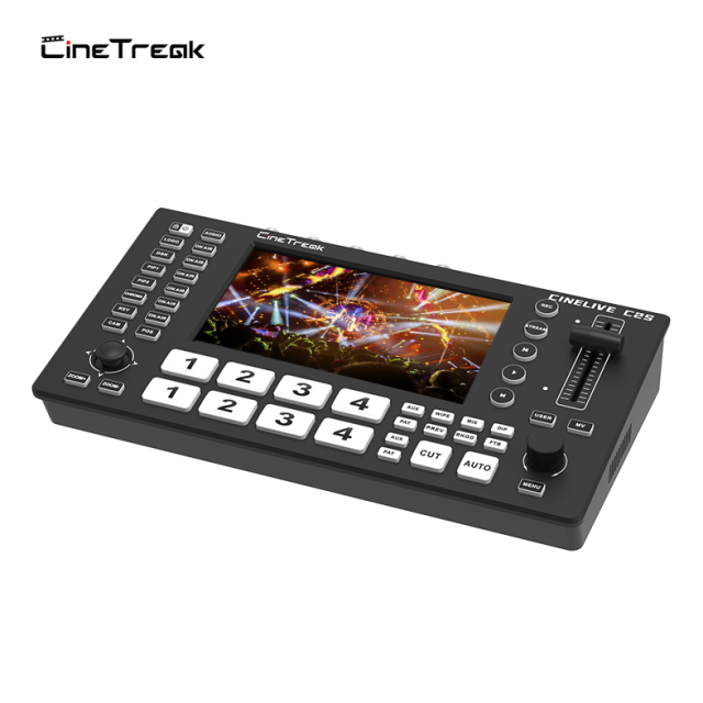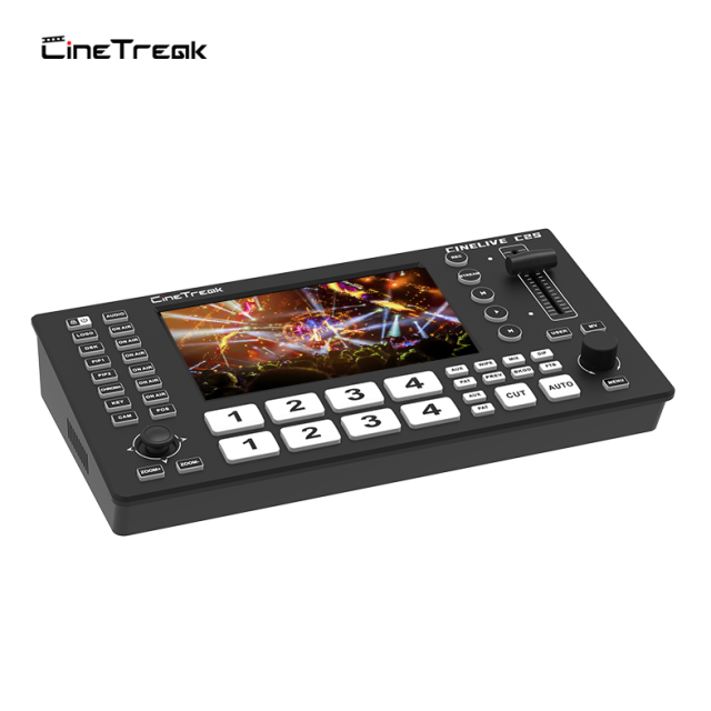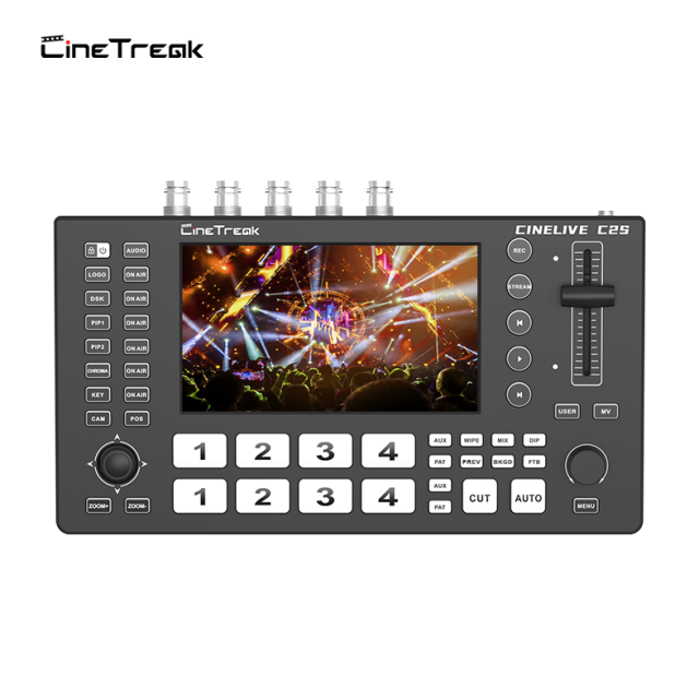 CineTreak Cinelive C2S je kompaktní profesionální video přepínač s 5,5palcovým dotykovým displejem, flexibilním hybridním vstupem HDMI/SDI, ovládáním kamery PTZ, duálním streamováním RTMP a pokročilým klíčováním chroma/luma. Je navržen pro moderní živé přenosy a hybridní akce a kombinuje výkon a přenosnost v hliníkovém těle.