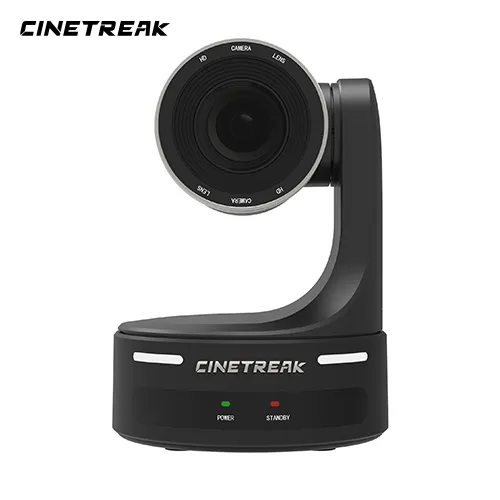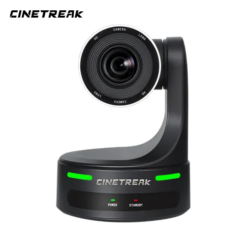 CineTreak CT-PT20 je kamera PTZ s vysokým rozlišením určená pro dynamickou produkci videa a streamování. Je vybavena 1/2,8" HD snímačem CMOS, zachycuje plynulé video v rozlišení Full HD 1080p60 a je vybavena funkcí automatického sledování, která zajišťuje, že prezentující nebo řečníci zůstanou v záběru bez nutnosti ručního nastavení. Díky 20x optickému zoomu a 16x digitálnímu zoomu umožňuje přesné přiblížení i z velké vzdálenosti, takže je vhodná pro posluchárny, učebny, studia a místa konání akcí.