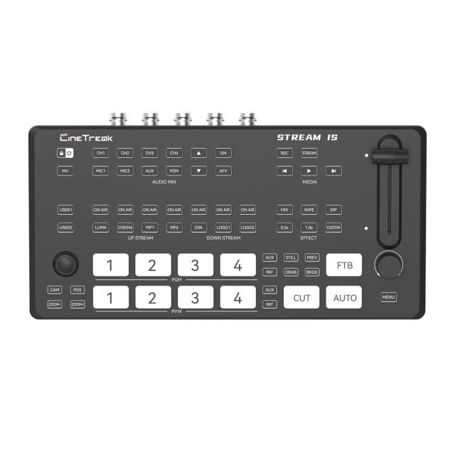 CineTreak Stream 1S je robustní profesionální přepínač pro živé vysílání, který byl zkonstruován tak, aby splňoval požadavky na živou produkci s více kamerami. Je vybaven 4 vstupy SDI, 1 výstupem PGM, 1 výstupem PVW/AUX a 6 vstupními kanály včetně SDI, AUX, médií na pozadí a downstreamových zdrojů a umožňuje dynamické, vícevrstvé živé přepínání.