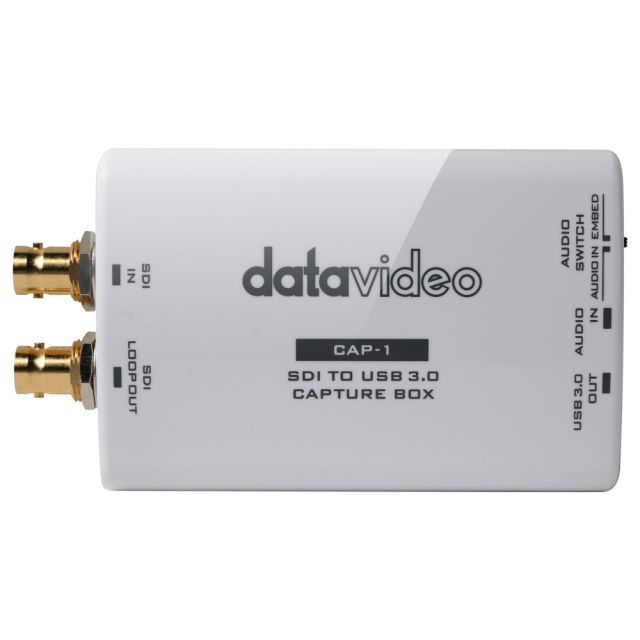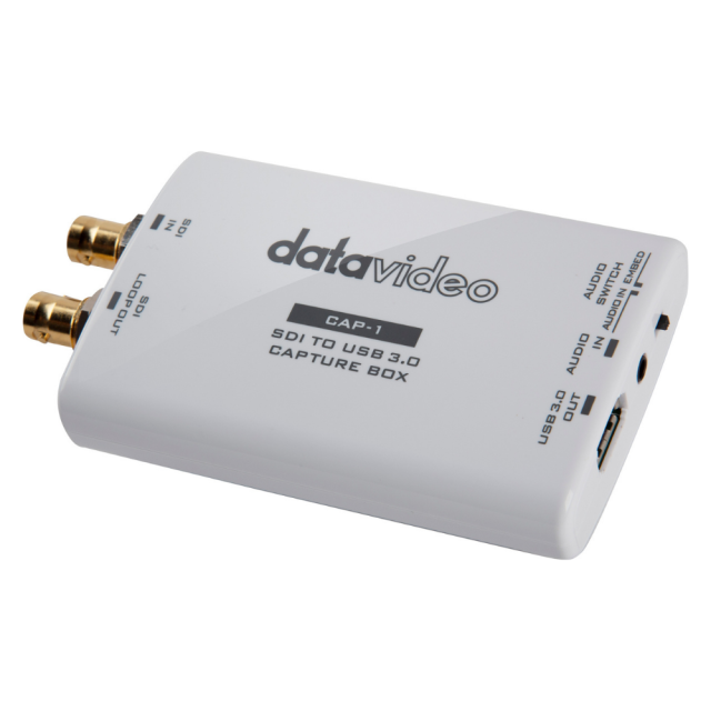Datavideo CAP-1 je SDI > USB 3.0 UVC zařízení pro záznam nebo streaming až 1080p50/60 videa z HD/3G-SDI zařízení do počítačů s OS Windows, Linux a macOS s některou z podporovaných aplikací/služeb (OBS, VLC, Skype apod.). Nabízí průchozí SDI vstup, podporu vloženého i externího zvuku a plně plug-and-play instalaci. V prodeji od 7/8 2020.