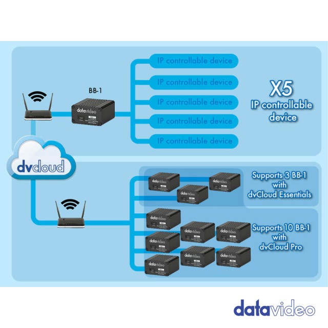 BB-1 KIT, který umožňuje zákazníkům vytvářet vzdálené produkce odkudkoli na světě. BB-1 poskytuje vzdálený přístup k zařízením Datavideo přes internet a funguje jako server DHCP, který automaticky přiděluje virtuální IP adresy všem připojeným zařízením v cloudu. Spolu s předplacenou službou streamování dvCloud může každé zařízení BB-1 spravovat až pět zařízení Datavideo, která jsou připojena k síti. předplacená služba dvCloud Essentials podporuje dvojici zařízení BB-1 a dvCloud Professional podporuje šest zařízení BB-1, což umožňuje používat až 25 vzdálených zařízení. Předplatné služby dvCloud spravuje streamy až pro pět cílových míst na kanál, přičemž služba Professional podporuje až pět kanálů.
