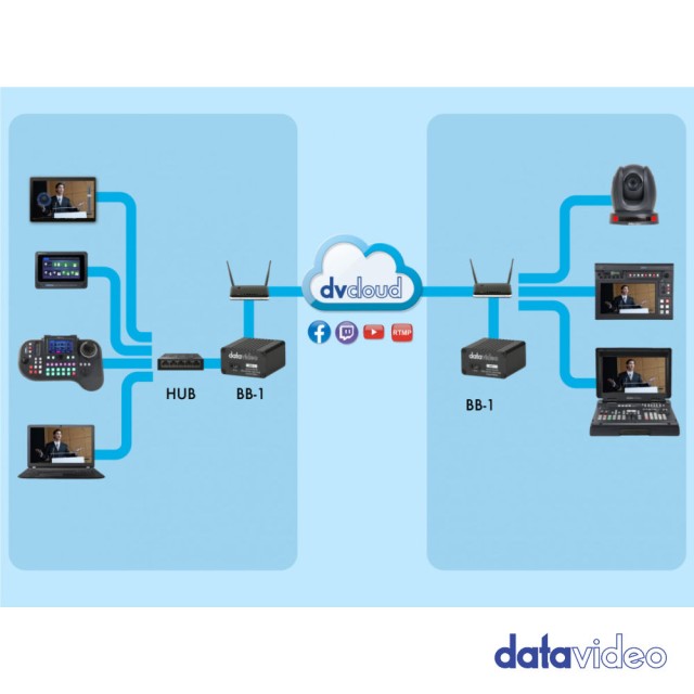Zařízení BB-1 využívá DVIP, vlastní IP protokol společnosti Datavideo, který umožňuje kdykoli a odkudkoli vzdáleně ovládat jakékoli zařízení Datavideo podporující IP v síti. Vše, co potřebujete, je předplatné streamovací služby dvCloud, BB-1 na straně místa konání a další BB-1 na vzdálené straně.