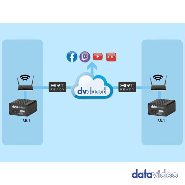 BB-1 KIT, který umožňuje zákazníkům vytvářet vzdálené produkce odkudkoli na světě. BB-1 poskytuje vzdálený přístup k zařízením Datavideo přes internet a funguje jako server DHCP, který automaticky přiděluje virtuální IP adresy všem připojeným zařízením v cloudu. Spolu s předplacenou službou streamování dvCloud může každé zařízení BB-1 spravovat až pět zařízení Datavideo, která jsou připojena k síti. předplacená služba dvCloud Essentials podporuje dvojici zařízení BB-1 a dvCloud Professional podporuje šest zařízení BB-1, což umožňuje používat až 25 vzdálených zařízení. Předplatné služby dvCloud spravuje streamy až pro pět cílových míst na kanál, přičemž služba Professional podporuje až pět kanálů.