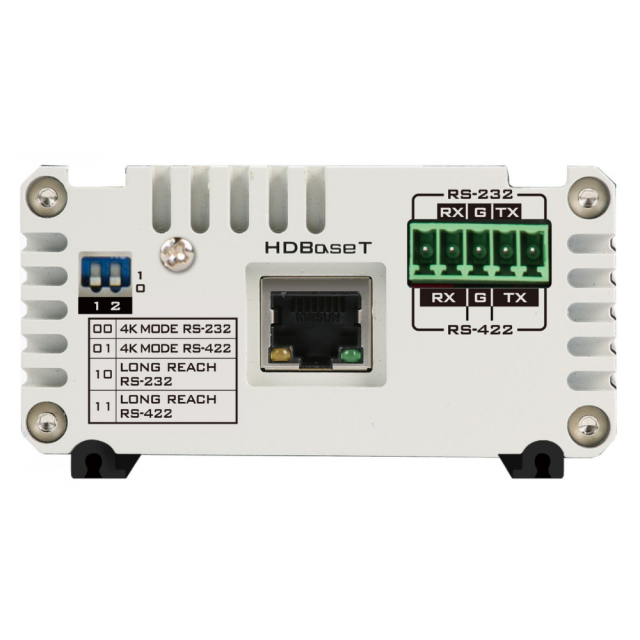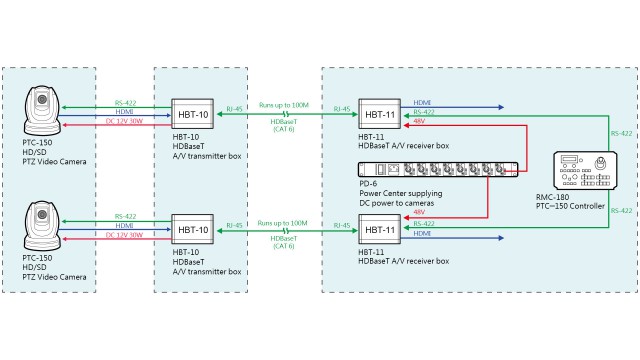 Přijímač pro PTZ kamery (PTC-140T/150T) s rozhraním HDBaseT. Dovoluje přenášet video, audio, DVIP povely (RJ-45), RS-422/232 povely (rozhraní Phoenix) a PoE napájení po jediném Cat.5e/6/6a/7 kabelu na vzdálenost až 100 m v FHD režimu. HDMI výstup s podporou formátů 3840x2160p30/29,97/25/24/23,98, 1080p60/59,94/50/30/29,97/25/24/23,98, 1080i60/59,94/50, 720p60/59,94/50. Dodává se vč. 48V= napáječe a redukce Phoenix > RJ-45.