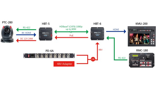 Vysílač pro HDBaseT rozhraní pro přenos HDMI signálu na vzdálenost až 60 m v rozlišení 1080p resp 35 m ve 4K@30 pomocí Cat 6 kabelu. Podporuje HDMI Deep Colour a Full 3D, rozlušení až 4K/2K@30, HDCP 2.2/1.4, DTS-HD Master Audio a Dolby TrueHD audio atd. Nechybí podpora Power-over-Ethernet (PoE) napájení a RS-232/RS-422 povelů. Dodává se vč. 48V= napáječe.
