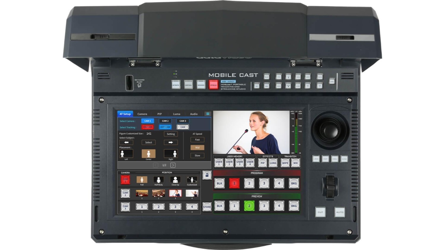 HS-1650T spojuje šest výkonných produkčních funkcí – přepínání, streamování, nahrávání, mixování zvuku, monitorování a ovládání kamery – vše v odolném přenosném kufříku. Ať už vysíláte živě z konferenční místnosti, auditoriu nebo vzdáleného místa, tento systém vše v jednom vám poskytuje plnou kontrolu nad produkcí na dosah ruky. Žádná složitá nastavení. Stačí zapojit, zapnout a vysílat živě.