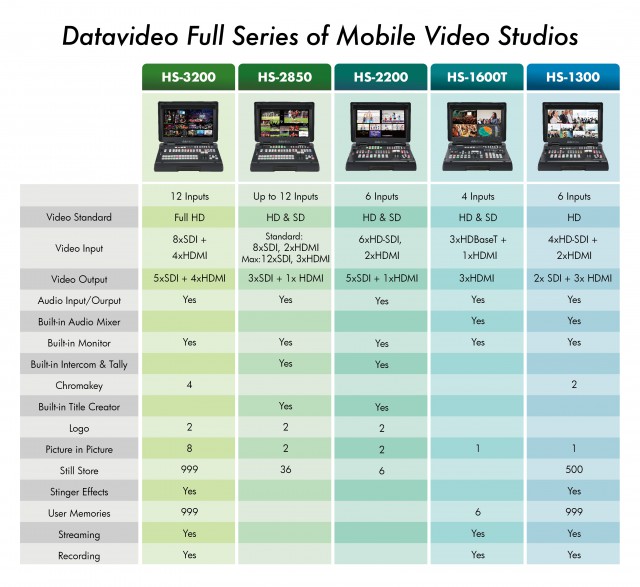 Datavideo HS-2850-8 je prenosná SD/HD 8 kanálová video réžia so 17,3" LCD displejom, disponujúca efektami, zabudovaným intercomom a tally systémom.