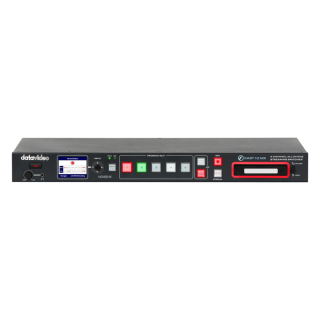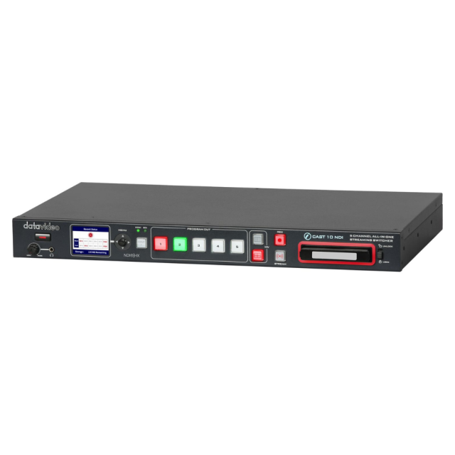 Datavideo iCAST 10NDI integruje funkce režie, ovladače PTZ kamer a streamovacího enkodéru (a rekordéru) v jeden celek. Nabízí 5 video vstupů vč. jednoho SDI/HDMI, tří HDMI a jednoho USB 3.0, navíc podporuje import IP videa (RJ-45). Vysílat lze pomocí protokolů RTMP(S) nebo SRT a navíc i zaznamenávat na SD kartu (ISO záznam šesti kanálů). Samozřejmostí je multiview zobrazení, titulkování apod.