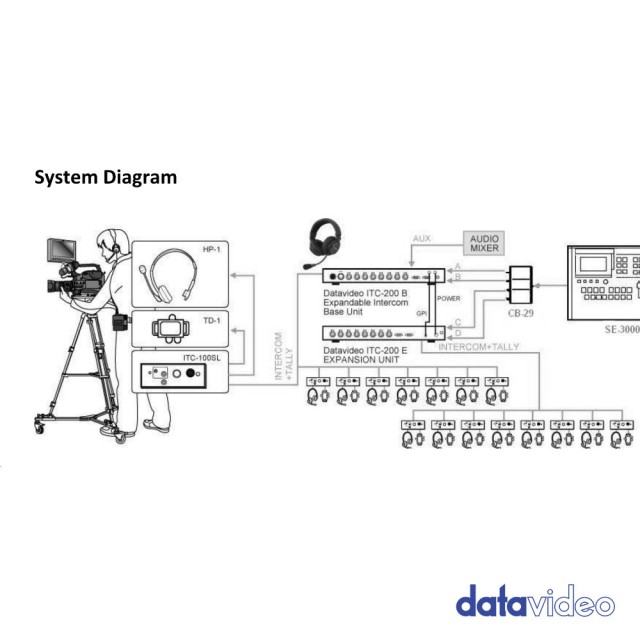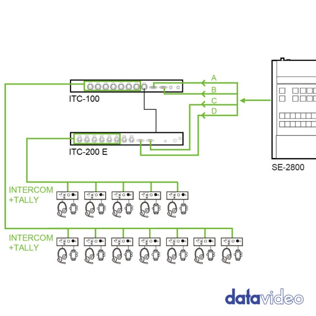 ITC-200E poskytuje dalších 8 kanálů k tally/talkback systému Datavideo ITC-100. Kombinace ITC-100/ITC-200E vám efektivně poskytne 15kanálový systém. Kombinace ITC-100/ITC-200E umožňuje operátorovi hovořit s kanály 1-7 samostatně a se zbylými 8 jako se skupinou nebo se všemi 15 kanály najednou.