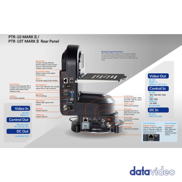 PTR-10 MARK II podporuje mnoho signálových rozhraní pro průchod dálkovou hlavou. Mezi tato rozhraní patří SDI, HDMI, RS-232, RS-422, DVIP, Tally a LANC.
