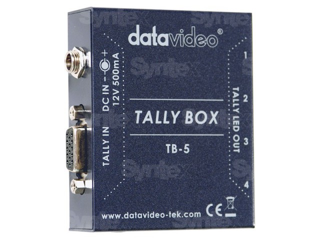 Datavideo TB-5 Tally Box je voliteľné príslušenstvo k videoréžii SE-500 alebo SE-900 a slúži na prenos TALLY príkazov z videoréžie priamo do štyroch svetielok signalizujúcich stav z réžie. Univerzálne svetielka TD-1 (súčasťou balenia, predávané aj samostatne pod označením TD-1) sú prepojené s TB-5, z ktorého si berú aj napájanie.