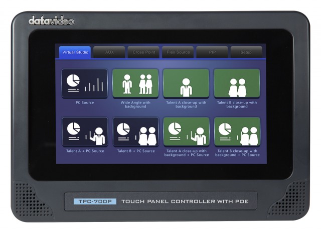 Ovládací panel se 7“ dotykovým displejem a podporou PoE. Jde o ideální řešení pro režie řady Datavideo 3200, prezentační systém VGB-2000, v součinnosti s klíčovacím řešením DVK-400 (podporuje funkce Lumakey, Blur Background a Aux Layer Swap). Díky podpoře PoE se panel připojuje jediným kabelem (napájení i data), snadnou instalaci podtrhuje také velice kompaktní provedení (220x152x79 mm, 0,85 kg). Samozřejmostí je plná konfigurovatelnost tlačítek.