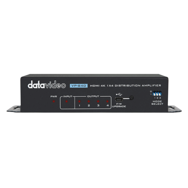 Datavideo VP-840 je distribuční zesilovač HDMI 1x4 s možností opakovaného přenosu zdroje HDMI na 4 displeje současně. VP-840 podporuje přenosovou rychlost až 18 Gpbs a rozlišení 4K2K@60Hz a je kompatibilní s HDMI 2.0 a HDCP 2.2. Model VP-840 je vybaven správou EDID s funkcí automatického snižování měřítka, čímž poskytuje více možností EDID pro různá výstupní rozlišení mezi všemi zařízeními a zajišťuje správné zobrazení obsahu zdroje HDMI na monitorech.