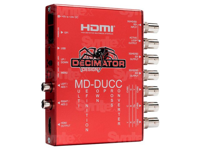Decimator Design MD-DUCC je multi-Definition Up/Down/Cross konverter. Audio zdroj pre všetky štyri stereo páry v HDMI výstupe môže byť zvolený z ôsmich stereo párov dostupných v SDI vstupe. Keď je aktívny scaler, audio zdroj pre všetkých osem stereo párov v SDI výstupe môže byť zvolený z ôsmich stereo párov dostupných na SDI vstupe.
