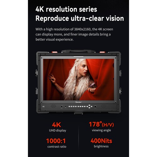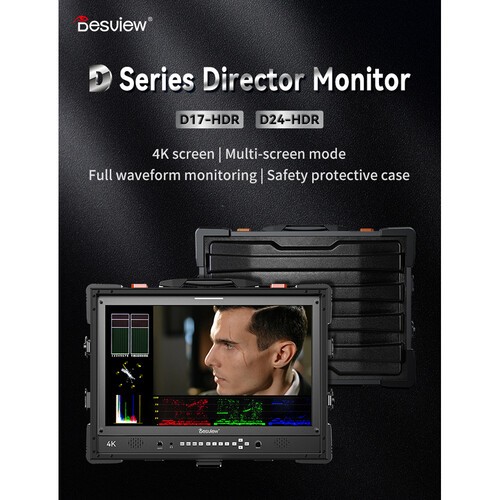 Desview D17-HDR je profesionální 17,3palcový 4K HDR vysílací monitor s HDMI a 3G-SDI vstupem/výstupem, režimy zobrazení více obrazů, nástroji pro analýzu signálu a odolným ochranným pouzdrem, určený pro terénní produkci, vysílání a monitorování v kinech.