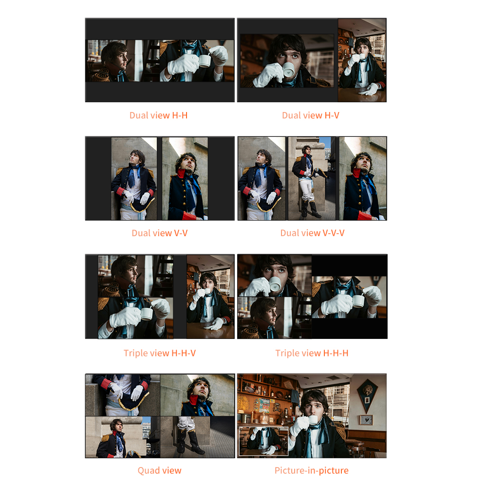 Horizontální a vertikální monitorování Režim monitorování více zobrazení Jako průkopník vertikálních obrazovek v oboru vybavila společnost Desview modely OL14/OL16 osmi režimy monitorování (jednoduchý, dvojitý, trojitý a čtyřnásobný rozdělený obraz), podporuje volné horizontální a vertikální přepínání a nahrazuje tak několik tradičních monitorů jedním zařízením, které je ideální pro vertikální krátké dramata, krátká videa a živé přenosy. |